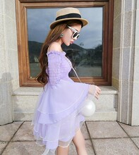 包邮仙女风一字领露肩裹胸抹胸大喇叭袖收腰蛋糕蓬蓬连衣裙