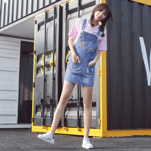 2017春夏女装新款 吊带连衣裙清纯甜美破洞牛仔背带短裙