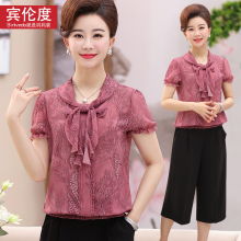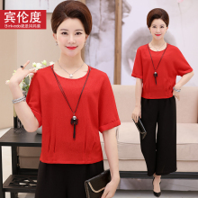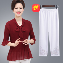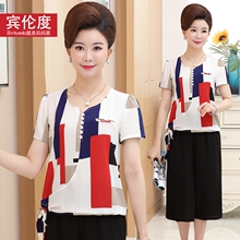中年女妈妈装夏装套装短袖t恤40-50岁雪纺衫上衣中老年夏季两件套