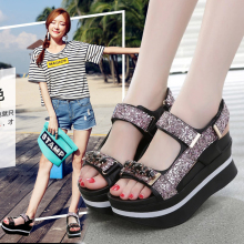 欧洲站2017夏季新款时尚鱼嘴厚底内增女鞋水钻高跟罗马松糕凉鞋女
