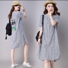2017夏装大码文艺棉麻条纹衬衫连衣裙女中长款短袖休闲棉上衣