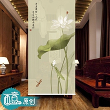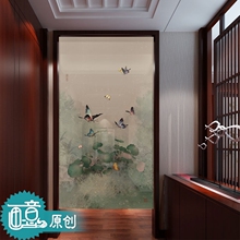 画意玄关软隔断挂帘/风水帘布艺长门帘半透明防蚊【蜻蜓双白莲P】