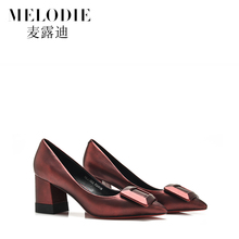 2017春季新款真皮鞋方扣尖头粗跟单鞋百搭黑色通勤中跟工作鞋女鞋