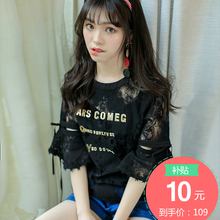 欧罗兰2017春装新款甜美喇叭七分袖系带字母印花性感蕾丝雪纺衫女