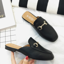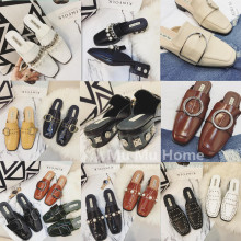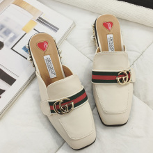 17年早春新款拖鞋韩版方头中口包头拖鞋金属搭扣粗跟中跟低帮鞋女