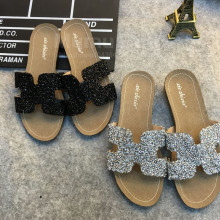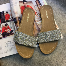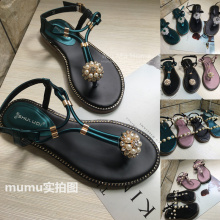 2017夏季新款韩版水钻珍珠金属一字扣平底凉鞋女士露趾平跟沙滩鞋