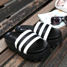 正品2017夏季新款高跟拖鞋女时尚休闲韩版松糕厚底条纹一字凉鞋女