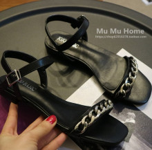 欧美休闲金属链条罗马一字扣平跟凉鞋女夏新款百搭细带露趾平底鞋