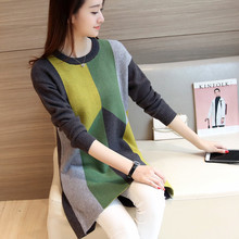 秋冬新款韩版圆领宽松套头长袖中长款拼色打底针织衫毛衣女上衣潮