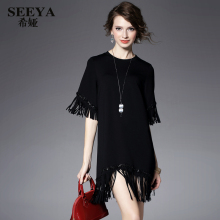 希娅夏季时尚短袖圆领宽松直筒钉珠棉绸连衣裙流苏短裙