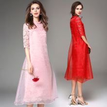 春秋民族风中长款蕾丝连衣裙 A型敬酒服礼服改良中国风旗袍欧根纱