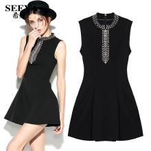 春秋复古修身无袖连衣裙小黑裙 钉珠打底背心名媛礼服A字马甲短裙