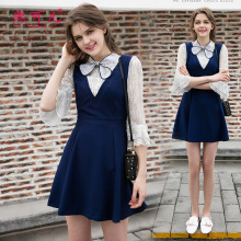 2017春夏新款学院风假两件喇叭袖蝴蝶结收腰淑女显瘦连衣裙修身女