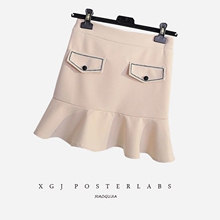 2017春夏新款韩版假口袋高腰短裙鱼尾裙半身裙女荷叶边a字包臀裙
