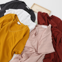 Miss菜头自留简洁百搭慵懒包扣V领口袋透气舒适长袖T恤女打底衫