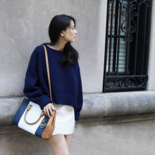 2017春季新款高圆圆明星同款藏蓝色不规则宽松套头修身长袖毛衣女