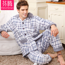 芬腾珊瑚绒夹棉睡衣男士秋冬季三层加厚加绒大码法兰绒家居服套装