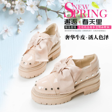 欧洲站2017春季新款真皮女鞋圆头蝴蝶结厚底粗跟单鞋休闲低帮鞋子