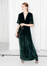 春季新款欧美金丝绒长款连衣裙欧美褶皱性感V领中袖大摆长裙礼服