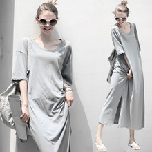 夏季新款韩版大码莫代尔长款连衣裙胖mm圆领五分袖宽松开叉长裙