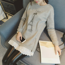 孕妇装连衣裙春秋新款大码宽松打底衫上衣韩版蕾丝拼接中长款卫衣
