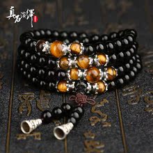 韩版108颗佛珠仿黑曜石手链多圈男女款饰品配黄虎晶藏银情侣礼物