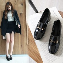 春秋百搭气质休闲方头女鞋粗跟鞋金属装饰漆皮单鞋潮鞋韩版中跟鞋