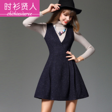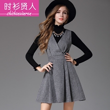 时衫贤人秋冬新款韩版修身显瘦毛呢无袖连衣裙背心裙 A字裙