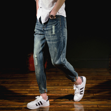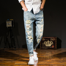 男士九分裤破洞9分裤子小脚牛仔裤学生日系修身哈伦裤青年韩版潮