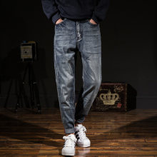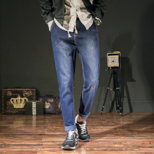 日系复古牛仔裤男春秋宽松收脚弹力简约哈伦裤男系带韩版长裤子潮
