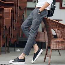 夏季韩版薄款休闲裤男青年修身小脚裤格子男士九分裤弹力英伦裤子