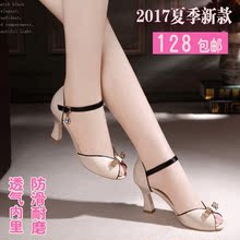大码粗跟单鞋女春季浅口金特 百丽真皮镂空凉鞋水钻透气中跟女鞋