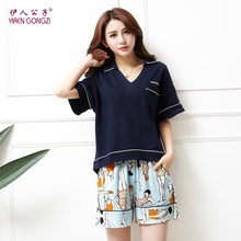 伊人公子夏季女士纯棉睡衣性感V领女人短袖家居服薄款女全棉套装