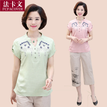 中老年女装棉麻短袖两件套夏装新款大码中年妈妈短袖T恤+裤子套装