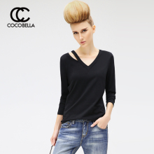 【2件259】COCOBELLA 新款V领镂空女修身显瘦长袖百搭棉T恤TE41