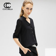 COCOBELLA 2017春季新品长袖立领不对称下摆女黑色雪纺衬衫KT3