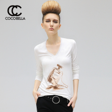 【2件259】COCOBELLA 春装手绘印花女修身显瘦V领印花打底T恤TE97