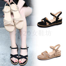 罗马凉鞋女夏2017新款韩版复古平底坡跟交叉绑带厚底松糕学生凉鞋