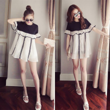 夏装新款宽松中长款拼接荷叶边短袖雪纺衫女大码T恤上衣潮娃娃衫