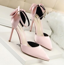 韩版甜美高跟鞋女鞋细跟高跟浅口尖头绸缎中空后蝴蝶结一字带凉鞋