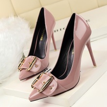 2017欧美夏季皮带扣细跟单鞋女高跟鞋漆皮浅口侧空尖头细跟高跟鞋