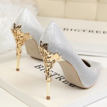 2017新款欧美亮片尖头高跟鞋细跟性感夜店女鞋浅口宴会银色伴娘鞋