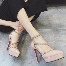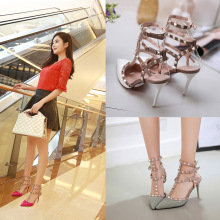 欧美风春季新款性感名媛时尚单鞋铆钉细跟高跟尖头鞋大女人