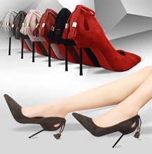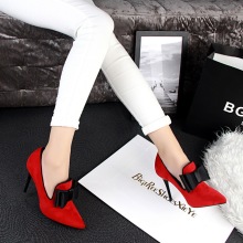 韩版时尚甜美细跟高跟显瘦绒面尖头深口蝴蝶结单鞋 高跟鞋