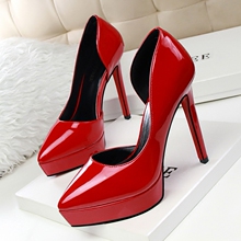 2017春秋欧美10CM金属亮面尖头高跟鞋细跟漆皮女单鞋红色浅口婚鞋