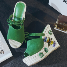 夏季草编厚底超高跟磨砂鱼嘴室外防水台花朵真皮坡跟凉拖鞋女绿色
