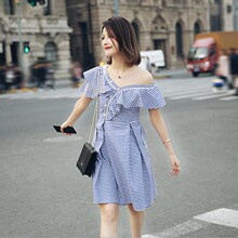 2017春夏装新款欧美风SP同款荷叶斜肩蓝白条纹连衣裙