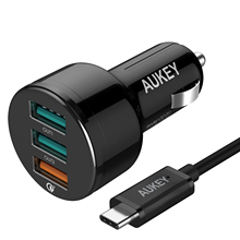 Aukey多口usb车载充电器一拖三qc3.0快充多孔车充点烟器小米苹果