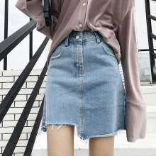 [言莎]韩国订单 2017韩版新款高腰抓纹不规则毛边半身短裙牛仔裙