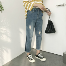 [言莎]韩国订单 韩版2017磨白直筒破洞撕边不规则牛仔九分裤女裤